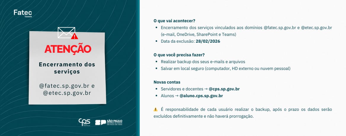 Encerramento de Serviços: Todos os serviços oferecidos pela Microsoft nos domínios @etec.sp.gov.br e fatec.sp.gov.br (E-mail, OneDrive, SharePoint e Teams) serão desativados e todo o conteúdo será excluído.